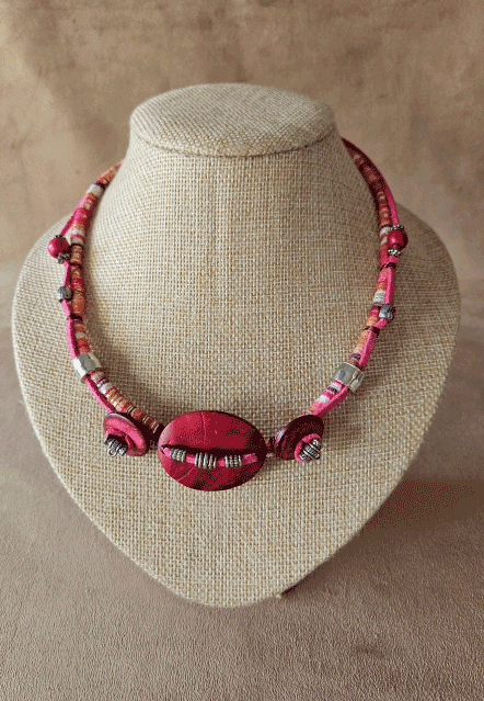 Collar realizado con maderas teñidas y aguayos traídos del noroeste de nuestro país. Línea latinoamericana.