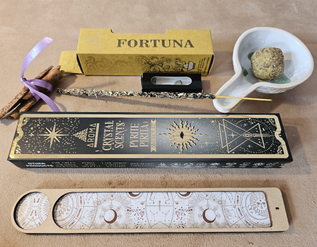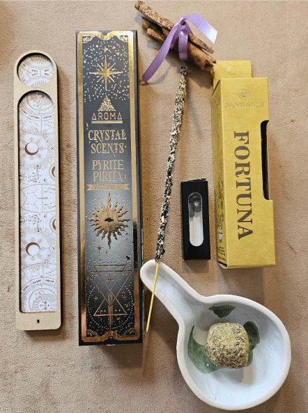 Incluye: 1 caja de Sahumerios Aroma Cristal de Pirita. Esferas Mágicas Fortuna. Porta- sahumerio de Madera. Sahumador de Cerámica. Este kit es esencial para el trabajo en los rituales de Prosperidad y Abundancia, tiene lo más importante. Sahumerios con un aroma ideal que conecte con la intención, acompañado de pirita, cristal óptimo para la Abundancia. Las Esferas Mágicas preactivadas son especiales para un sahumo eficaz. Nota aromática: de vainilla, canela, coco, ámbar, cacao y hojas de romero.