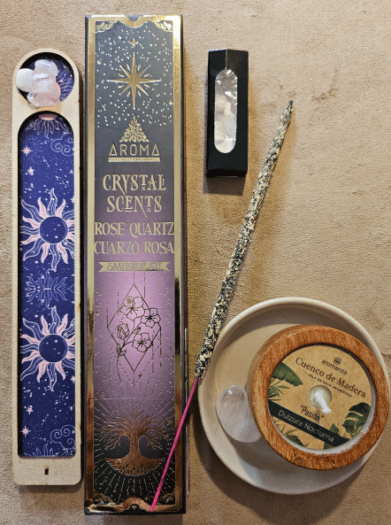 Incluye: 1 caja de Sahumerios Aroma Cristal de Cuarzo Rosa. Porta- sahumerio de Madera. Velita de Soja en Cuenco de Madera. Este kit es esencial para el trabajo en los rituales de amor en todas sus formas, tiene lo más importante. Sahumerios con un aroma ideal que conecte con la intención, acompañado de cuarzo rosa, cristal óptimo para la expansión y amplificación del amor. La velita es ideal para crear un ambiente agradable y sensible para disfrutar en soledad o en compañía.