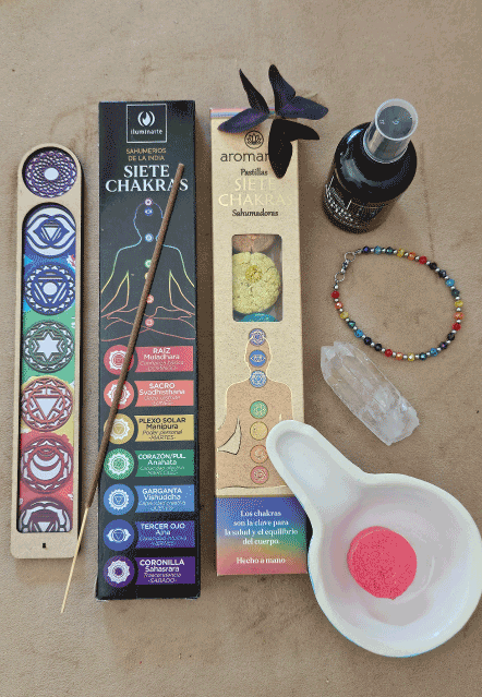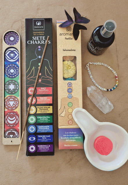 Incluye: 1 caja de Sahumerios 7 Chakras. Porta- sahumerio de Madera. Sahumador de Cerámica. Pastillas Sahumadoras 7 Chakras. Rocío Áurico Armonía de Chakras de 60 ml. Pulsera 7 Chakras (a elección). Este kit está pensado para armonizar los chakras. El rocío áurico es ideal para meditar, limpiar energéticamente y lograr un equilibrio entre los diferentes chakras. Usar en el campo áurico y después de la limpieza energética o en aquellos momentos en que se necesite claridad o desbloqueo de nuestros centros energéticos.
