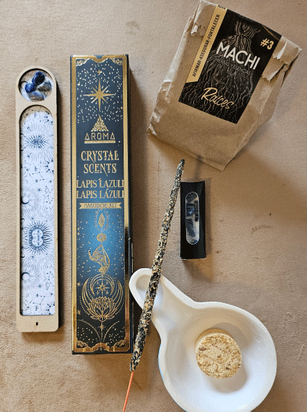 Incluye: 1 caja de Sahumerios Aroma Cristal de Lápis Lázuli. Porta- sahumerio de Madera. Machi Raíces. Sahumador de Cerámica. Este kit es esencial para fortalecer la comunicación, la intuición y la creatividad. Sahumerios con un aroma ideal que conecte con la intención, acompañado de Lápis Lázuli, cristal óptimo para la expansión y la creatividad. Se sugiere acompañar con velón tres días de color azul.