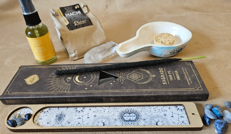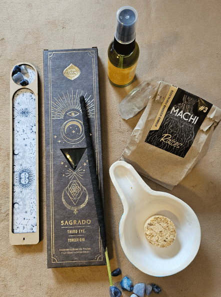 Incluye: 1 caja de Sahumerios Sagrado (Guía Espiritual oTercer Ojo) Porta- sahumerio de Madera. Sahumador de Cerámica. Machi Raíces. Loción Alquímica El Que Yo Soy. Este kit está pensado para fortalecer la comunicación, la intuición y la creatividad. Machi hierbas consagradas para sahumar. La loción alquímica es ideal para meditar, realizar trabajo espiritual, estudiar, crear. Usar en el campo áurico y después de la limpieza energética o en aquellos momentos en que se necesite claridad al momento de expresar ideas.