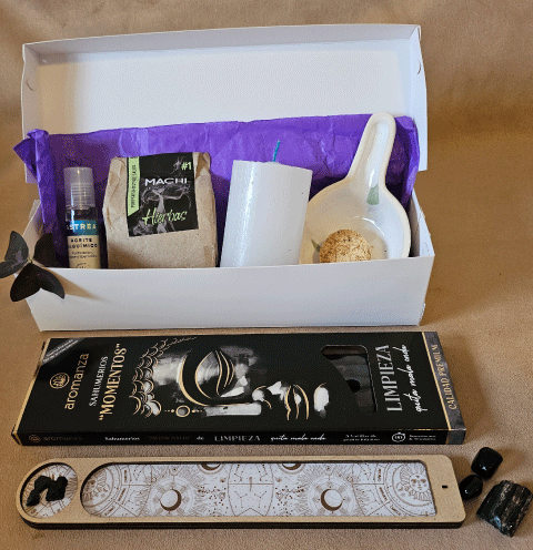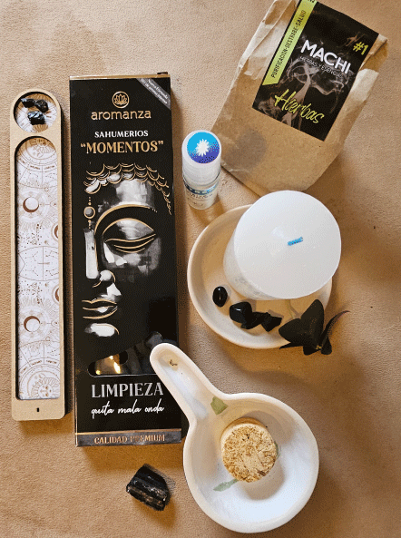 Incluye: 1 caja de Sahumerios Momentos Limpieza. Porta- sahumerio de Madera. Sahumador de Cerámica. Machi hierbas. Aceite alquímico Astrea roll on de 10 ml. Velón de tres días blanco.Este kit está pensado para tener como resultado una purificación emocional, física y/o ambiental efectiva que permita obtener claridad a la hora de tomar decisiones. Machi hierbas consagradas para sahumar. El Aceite Alquímico Astrea está pensado para la limpieza y purificación. Ayuda a elaborar duelos y dejar atrás situaciones que no permiten avanzar. Por ejemplo, trabajos, proyectos y vínculos. Modo de uso: usarlo en las zonas de las muñecas, nuca, sien. Se puede usar todos los días. La vela blanca es ideal para poner después de la limpieza energética.