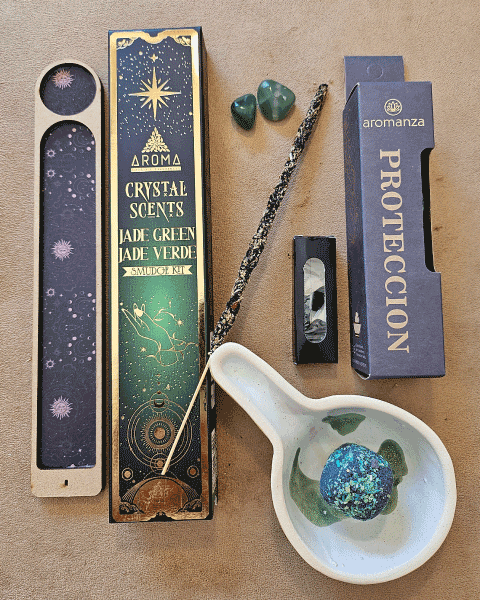Incluye: 1 caja de Sahumerios Aroma Cristal de Turmalina o Jade Verde o Labradorita o Ágata u Ojo de Tigre. Porta- sahumerio de Madera. Esferas Mágicas Protección o Super Palo Santo (A elección). Sahumador de Cerámica. Este kit es esencial para realizar limpiezas energéticas y tener como resultado protección y armonía. Sahumerios con un aroma ideal que conecte con la intención, acompañado de cristales óptimos para la protección, la armonía, la meditación, la calma. Se sugiere acompañar con velón tres días de color plateado.