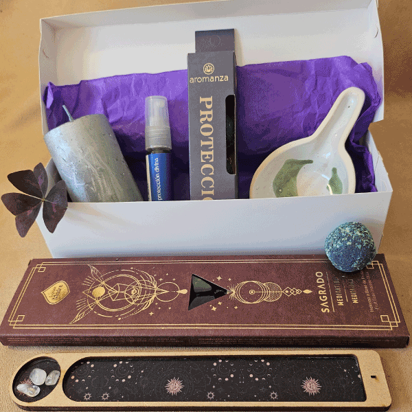 Incluye: 1 caja de Sahumerios Aroma Cristal de Turmalina o Jade Verde o Labradorita o Ágata u Ojo de Tigre. Porta- sahumerio de Madera. Esferas Mágicas Protección o Super Palo Santo (A elección). Sahumador de Cerámica. Este kit es esencial para realizar limpiezas energéticas y tener como resultado protección y armonía. Sahumerios con un aroma ideal que conecte con la intención, acompañado de cristales óptimos para la protección, la armonía, la meditación, la calma. Se sugiere acompañar con velón tres días de color plateado.
