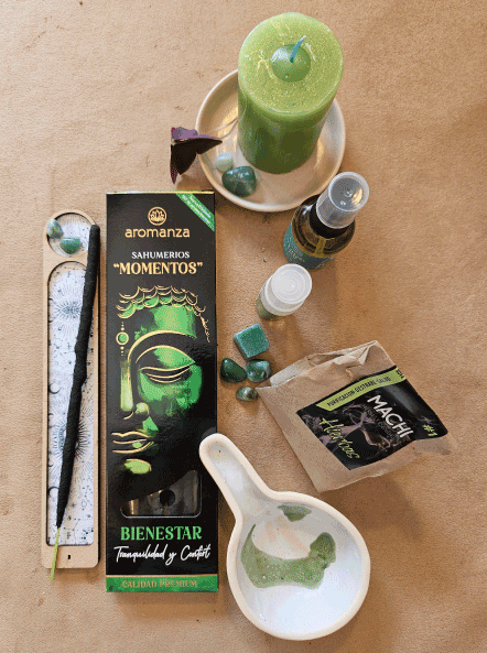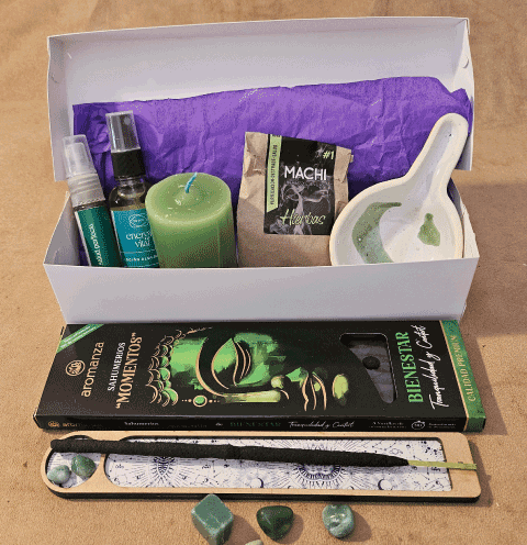 Incluye: Sahumerios Momentos Bienestar. Porta- Sahumerio de Madera. Machi Hierbas. Sahumador de Cerámica. Loción Alquímica Energía Vital de 30 ml. Loción Alquímica Salud Perfecta de 10 ml. Velón Tres Días Verde. Este kit sirve para equilibrar la salud fìsica y emocional. Conecta con la armonía interior y la calma. Promueve lel bienestar físico y emocional. Se sugiere añadir luego del sahumo, loción, tanto en el hogar como en nuestro campo áurico. Machi Hierbas es ideal para la purificación, destrabe, desbloqueos y para la salud. Este kit es una dosis de equilibrio para desarrollar una vida de bienestar e integración. Los productos no sanan, sólo ayudan a salir del desasosiego, acompañan para encontrar el diagnóstico o médico correcto.