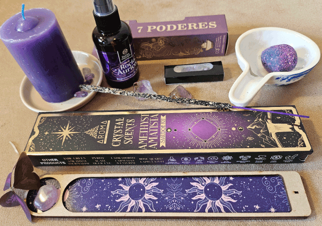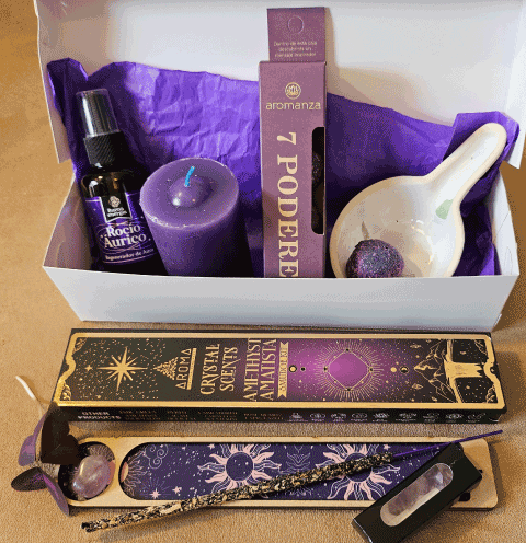 Incluye: 1 caja de Sahumerios Aroma Cristal de Amatista. Porta- sahumerio de Madera. Sahumador de Cerámica. Esferas Mágicas 7 Poderes. Rocío Áurico Regenerador del Aura. Velón Tres Días Violeta. Este kit está pensado para transmutar y transformar lo negativo en positivo. Y, además, obtener claridad mental para asimilar los cambios y hacerlos en plenitud. El rocío áurico es ideal para meditar, limpiar energéticamente y lograr un equilibrio entre los diferentes chakras. Usar en el campo áurico y después de la limpieza energética o en aquellos momentos en que se necesite claridad en la toma de decisiones. El velón se puede utilizar después de la limpieza energética intencionando todo aquello que queremos trabajar, mejorar, proteger, armonizar, transmutar.