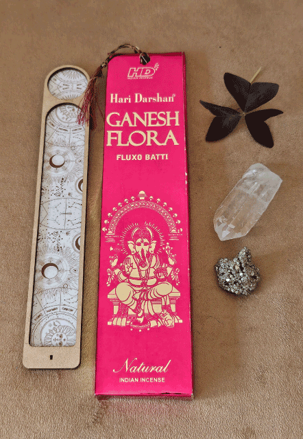 Es un canal hacia dimensiones superiores de paz y claridad. La fragancia se elabora con una cuidadosa selección de hierbas, flores, resinas y aceites esenciales, que se combinan según antiguas recetas ayurvédicas. Al encender una varilla de Ganesh Flora, invocas la presencia de Lord Ganesh, atrayendo su bendición para remover barreras, ya sean físicas, mentales o espirituales. Es ideal para meditaciones profundas, rituales de purificación y prácticas de yoga, ya que ayuda a equilibrar los chakras, especialmente el chakra raíz, promoviendo una base sólida y segura. Además, se cree que purifica el ambiente, eliminando energías negativas y proporcionando una atmósfera de protección y bienestar.